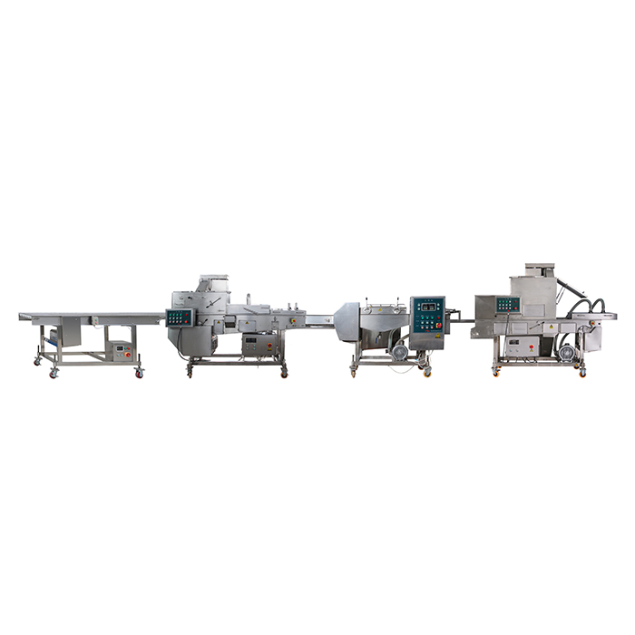 魷魚圈生產(chǎn)線把切好的魷魚圈或者其他海產(chǎn)品經(jīng)上粉,上稠漿,上鮮康,油炸,速凍等工藝做出裹粉的炸雞腿。面包蝦生產(chǎn)線的需要配置前處理設(shè)備和后處理設(shè)備:油炸,包裝等設(shè)備,