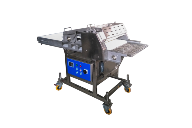 壓延機將新鮮或冷凍的原料肉經(jīng)過4道壓輥壓延至規(guī)定的厚度,增加產(chǎn)品的表面積,達到相同的熟化效果情況下,縮短了油炸時間。牛肉壓整機是牛排、雞排、豬排理想的生產(chǎn)設(shè)備之一。