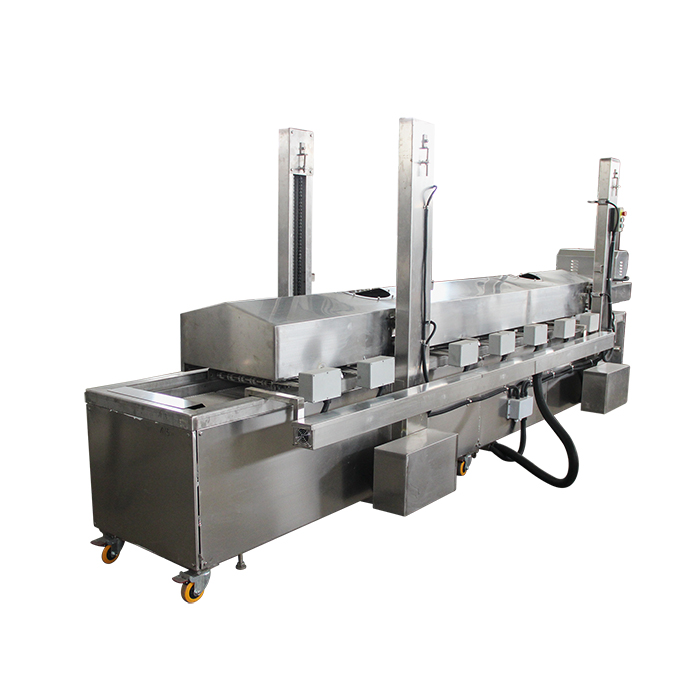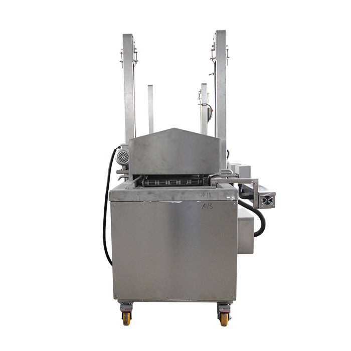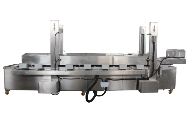 自動(dòng)油炸機(jī)是連續(xù)炸物機(jī),食品從機(jī)體的進(jìn)口端輸入后,隨輸送帶在熱油中通過(guò)時(shí)被油炸熟化,并從機(jī)體的出口端輸出。